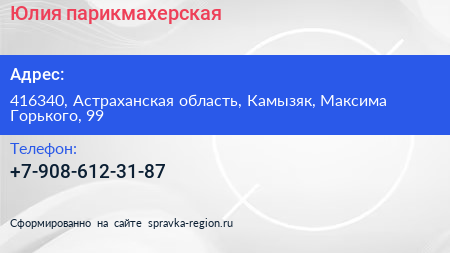 Юлия, парикмахерская по адресу 416340, Астраханская область, Камызяк, Максима Горького, 99 в дальнейшем Организация, размещена в следующих категориях: