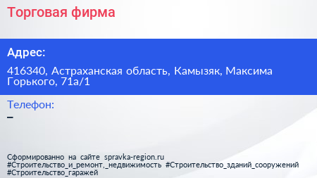 Торговая фирма по адресу 416340, Астраханская область, Камызяк, Максима Горького, 71а/1 в дальнейшем Организация, размещена в следующих категориях: