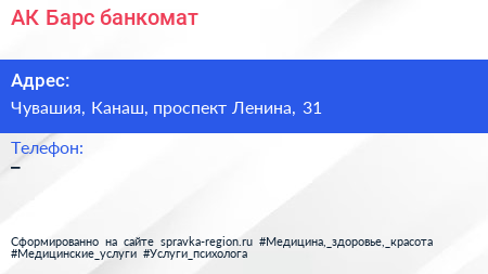 АК Барс, банкомат по адресу Чувашия, Канаш, проспект Ленина, 31 в дальнейшем Организация, размещена в следующих категориях: