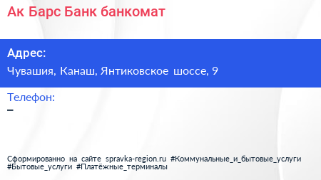 Ак Барс Банк, банкомат по адресу Чувашия, Канаш, Янтиковское шоссе, 9 в дальнейшем Организация, размещена в следующих категориях: