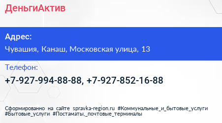 ДеньгиАктив по адресу Чувашия, Канаш, Московская улица, 13 в дальнейшем Организация, размещена в следующих категориях: