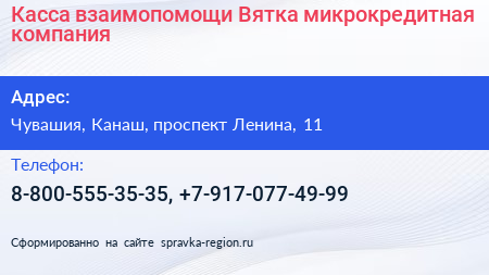 Касса взаимопомощи Вятка, микрокредитная компания по адресу Чувашия, Канаш, проспект Ленина, 11 в дальнейшем Организация, размещена в следующих категориях: