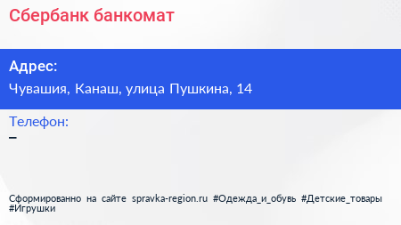 Сбербанк, банкомат по адресу Чувашия, Канаш, улица Пушкина, 14 в дальнейшем Организация, размещена в следующих категориях: