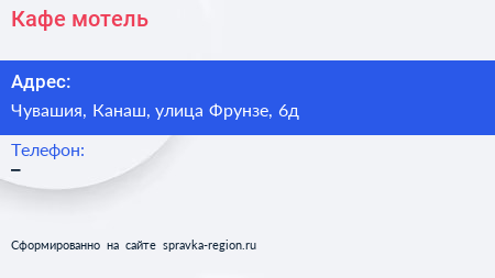 Кафе-мотель по адресу Чувашия, Канаш, улица Фрунзе, 6д в дальнейшем Организация, размещена в следующих категориях: