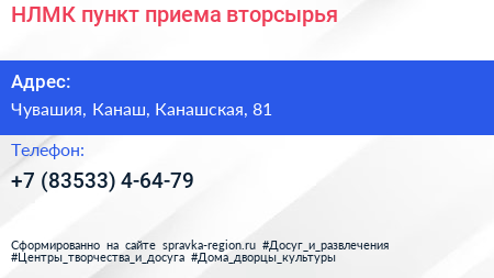 НЛМК, пункт приема вторсырья по адресу Чувашия, Канаш, Канашская, 81 в дальнейшем Организация, размещена в следующих категориях: