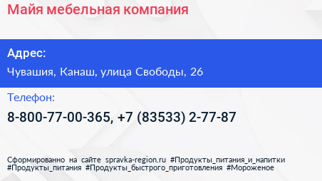 Майя, мебельная компания по адресу Чувашия, Канаш, улица Свободы, 26 в дальнейшем Организация, размещена в следующих категориях: