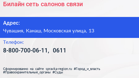 Билайн, сеть салонов связи по адресу Чувашия, Канаш, Московская улица, 13 в дальнейшем Организация, размещена в следующих категориях: