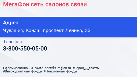 МегаФон, сеть салонов связи по адресу Чувашия, Канаш, проспект Ленина, 33 в дальнейшем Организация, размещена в следующих категориях: