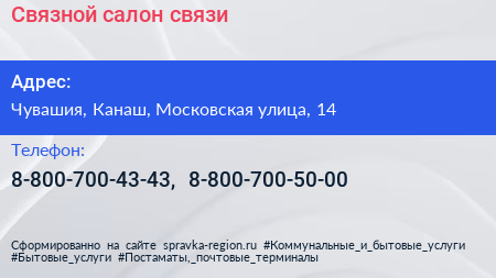 Связной, салон связи по адресу Чувашия, Канаш, Московская улица, 14 в дальнейшем Организация, размещена в следующих категориях: