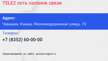 TELE2, сеть салонов связи по адресу Чувашия, Канаш, Железнодорожная улица, 73 в дальнейшем Организация, размещена в следующих категориях: