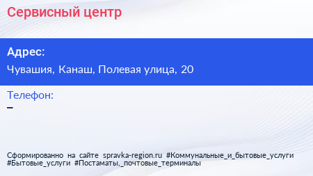 Сервисный центр по адресу Чувашия, Канаш, Полевая улица, 20 в дальнейшем Организация, размещена в следующих категориях: