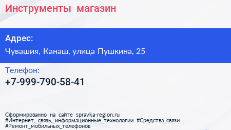 Инструменты+, магазин по адресу Чувашия, Канаш, улица Пушкина, 25 в дальнейшем Организация, размещена в следующих категориях: