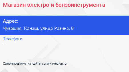 Магазин электро и бензоинструмента по адресу Чувашия, Канаш, улица Разина, 8 в дальнейшем Организация, размещена в следующих категориях: