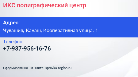ИКС, полиграфический центр по адресу Чувашия, Канаш, Кооперативная улица, 1 в дальнейшем Организация, размещена в следующих категориях: