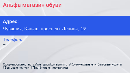 Альфа, магазин обуви по адресу Чувашия, Канаш, проспект Ленина, 19 в дальнейшем Организация, размещена в следующих категориях: