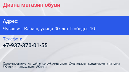 Диана, магазин обуви по адресу Чувашия, Канаш, улица 30 лет Победы, 10 в дальнейшем Организация, размещена в следующих категориях: