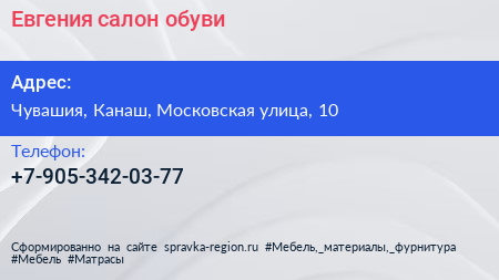 Евгения, салон обуви по адресу Чувашия, Канаш, Московская улица, 10 в дальнейшем Организация, размещена в следующих категориях: