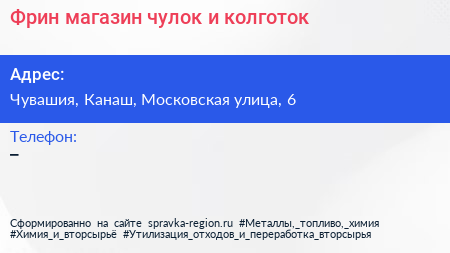 Фрин, магазин чулок и колготок по адресу Чувашия, Канаш, Московская улица, 6 в дальнейшем Организация, размещена в следующих категориях: