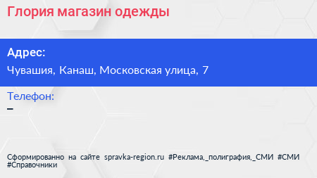 Глория, магазин одежды по адресу Чувашия, Канаш, Московская улица, 7 в дальнейшем Организация, размещена в следующих категориях: