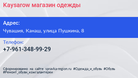 Kaysarow, магазин одежды по адресу Чувашия, Канаш, улица Пушкина, 8 в дальнейшем Организация, размещена в следующих категориях: