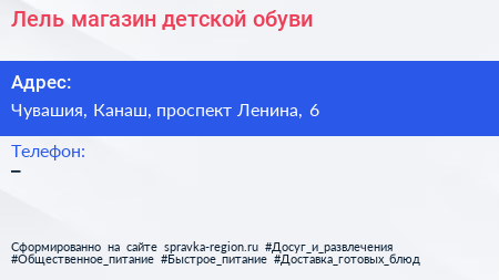 Лель, магазин детской обуви по адресу Чувашия, Канаш, проспект Ленина, 6 в дальнейшем Организация, размещена в следующих категориях: