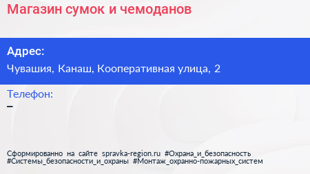 Магазин сумок и чемоданов по адресу Чувашия, Канаш, Кооперативная улица, 2 в дальнейшем Организация, размещена в следующих категориях: