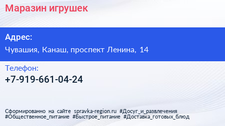 Маразин игрушек по адресу Чувашия, Канаш, проспект Ленина, 14 в дальнейшем Организация, размещена в следующих категориях: