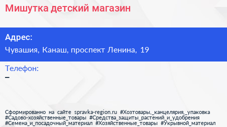 Мишутка, детский магазин по адресу Чувашия, Канаш, проспект Ленина, 19 в дальнейшем Организация, размещена в следующих категориях: