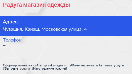 Радуга, магазин одежды по адресу Чувашия, Канаш, Московская улица, 4 в дальнейшем Организация, размещена в следующих категориях: