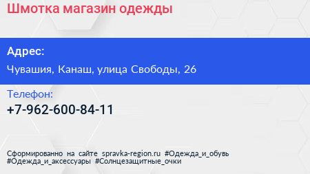 Шмотка, магазин одежды по адресу Чувашия, Канаш, улица Свободы, 26 в дальнейшем Организация, размещена в следующих категориях: