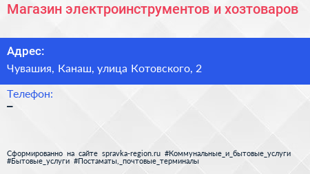 Магазин электроинструментов и хозтоваров по адресу Чувашия, Канаш, улица Котовского, 2 в дальнейшем Организация, размещена в следующих категориях: