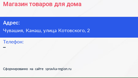 Магазин товаров для дома по адресу Чувашия, Канаш, улица Котовского, 2 в дальнейшем Организация, размещена в следующих категориях: