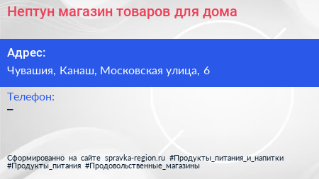 Нептун, магазин товаров для дома по адресу Чувашия, Канаш, Московская улица, 6 в дальнейшем Организация, размещена в следующих категориях: