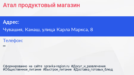 Атал, продуктовый магазин по адресу Чувашия, Канаш, улица Карла Маркса, 8 в дальнейшем Организация, размещена в следующих категориях: