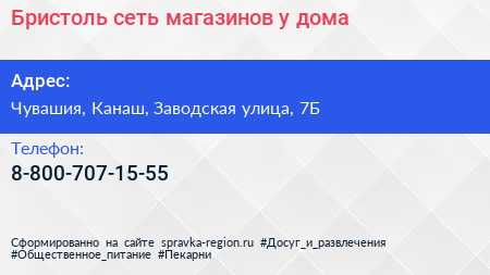 Бристоль, сеть магазинов у дома по адресу Чувашия, Канаш, Заводская улица, 7Б в дальнейшем Организация, размещена в следующих категориях: