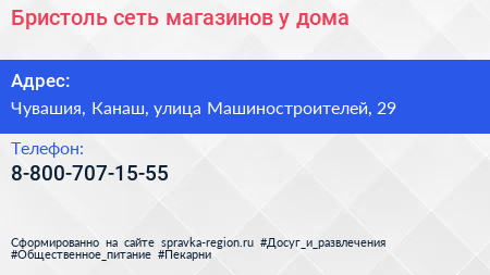 Бристоль, сеть магазинов у дома по адресу Чувашия, Канаш, улица Машиностроителей, 29 в дальнейшем Организация, размещена в следующих категориях: