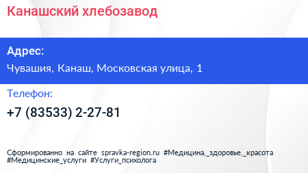 Канашский хлебозавод по адресу Чувашия, Канаш, Московская улица, 1 в дальнейшем Организация, размещена в следующих категориях: