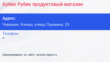 Кубик Рубик, продуктовый магазин по адресу Чувашия, Канаш, улица Пушкина, 23 в дальнейшем Организация, размещена в следующих категориях:
