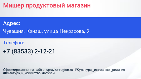 Мишер, продуктовый магазин по адресу Чувашия, Канаш, улица Некрасова, 9 в дальнейшем Организация, размещена в следующих категориях: