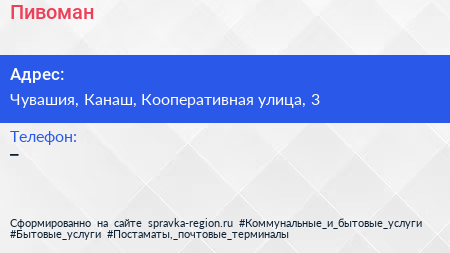 Пивоман по адресу Чувашия, Канаш, Кооперативная улица, 3 в дальнейшем Организация, размещена в следующих категориях: