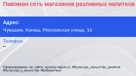 Пивоман, сеть магазинов разливных напитков по адресу Чувашия, Канаш, Московская улица, 16 в дальнейшем Организация, размещена в следующих категориях: