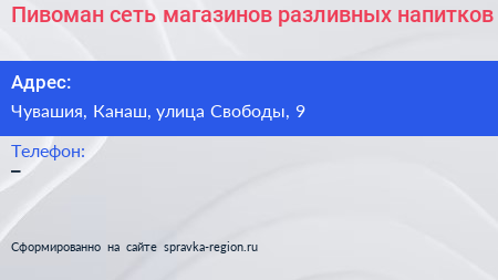 Пивоман, сеть магазинов разливных напитков по адресу Чувашия, Канаш, улица Свободы, 9 в дальнейшем Организация, размещена в следующих категориях: