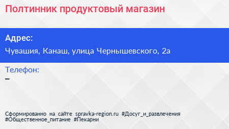 Полтинник, продуктовый магазин по адресу Чувашия, Канаш, улица Чернышевского, 2а в дальнейшем Организация, размещена в следующих категориях: