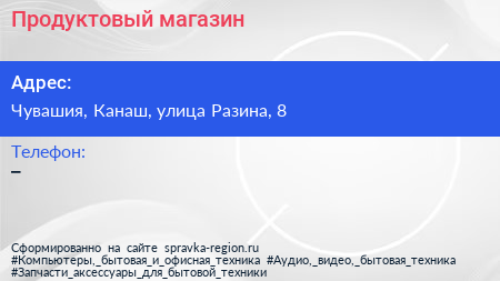Продуктовый магазин по адресу Чувашия, Канаш, улица Разина, 8 в дальнейшем Организация, размещена в следующих категориях: