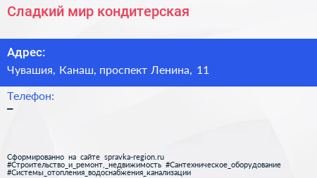 Сладкий мир, кондитерская по адресу Чувашия, Канаш, проспект Ленина, 11 в дальнейшем Организация, размещена в следующих категориях:
