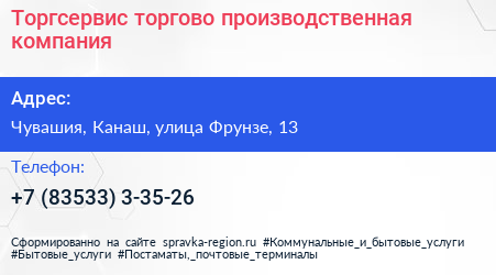 Торгсервис, торгово-производственная компания по адресу Чувашия, Канаш, улица Фрунзе, 13 в дальнейшем Организация, размещена в следующих категориях: