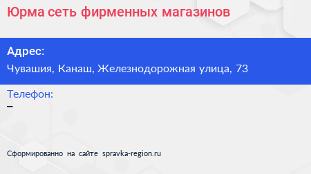 Юрма, сеть фирменных магазинов по адресу Чувашия, Канаш, Железнодорожная улица, 73 в дальнейшем Организация, размещена в следующих категориях: