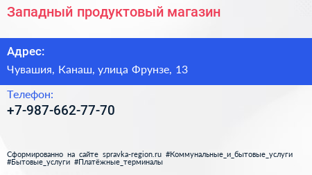 Западный, продуктовый магазин по адресу Чувашия, Канаш, улица Фрунзе, 13 в дальнейшем Организация, размещена в следующих категориях: