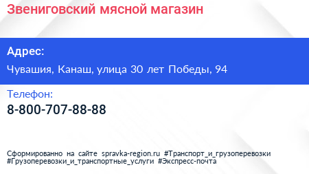 Звениговский, мясной магазин по адресу Чувашия, Канаш, улица 30 лет Победы, 94 в дальнейшем Организация, размещена в следующих категориях: