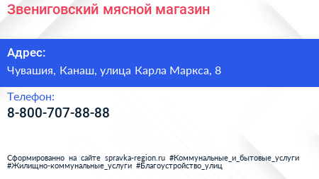 Звениговский, мясной магазин по адресу Чувашия, Канаш, улица Карла Маркса, 8 в дальнейшем Организация, размещена в следующих категориях: